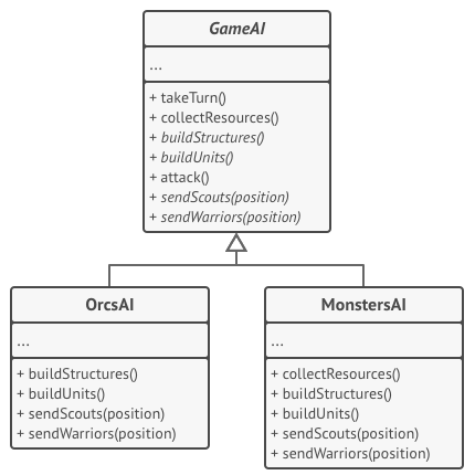 이 예제에서, Template Method 패턴은 간단한 전략 비디오 게임에서 다양한 인공지능 분기에 대한 "골격"을 제공합니다.