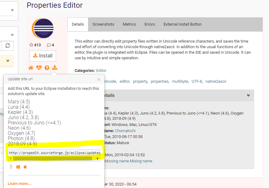 help > eclipse market place에서 properties 검색 후 맨 밑의 Browse for more solutions를 눌러 주소를 찾을 수 있다.