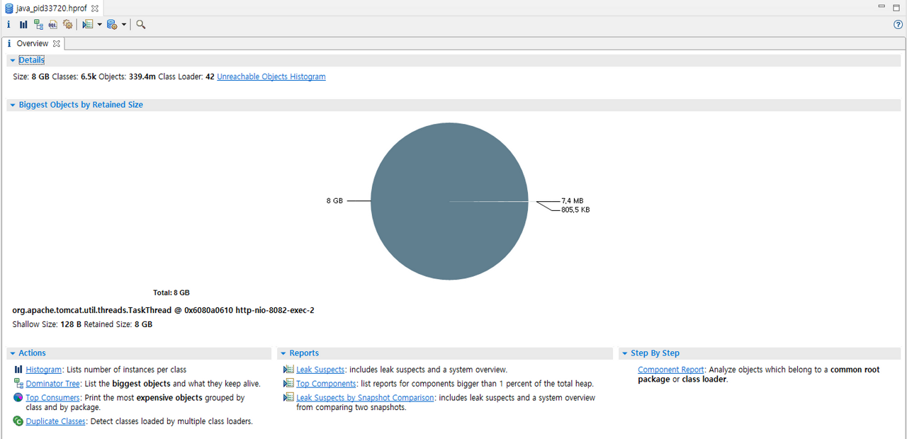 Dominator Tree 로 Heap Dump 뜰 당시에 만들어진 Java 객체를 한 눈에 확인 할 수 있다.