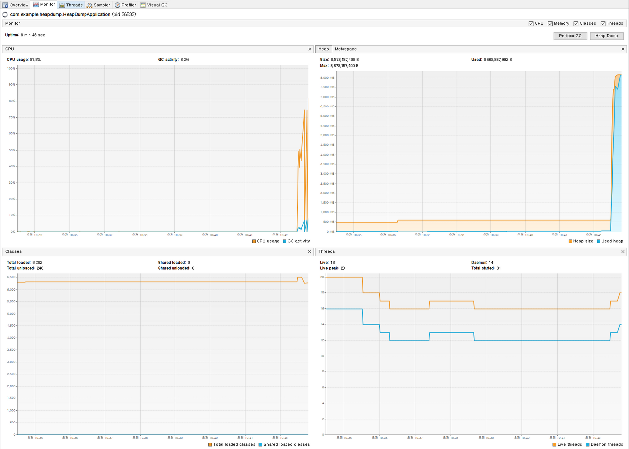 전반적인 CPU 사용량, Runtime Area 사용량을 볼 수 있다.
